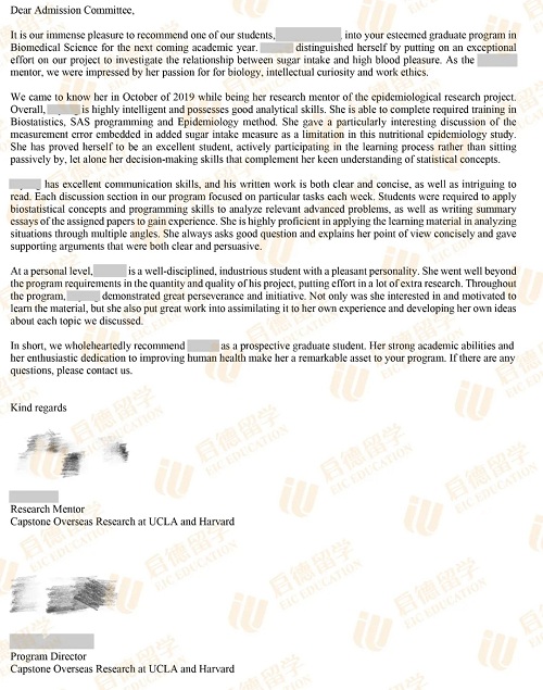 但是幸好学生想要学习生物医学相关专业的心够坚定,而且最主要的是规划时间比较早,让我们还有机会在大三选课时有一些发挥的空间。当时我们建议学生尽量选择跟生物相关的课程以及植物学,同时在线上学习生物基础课程,例如细胞分子学、数学建模与计算、高等数学等等。然后通过生物科研项目,提升自己的研究能力。在实践的过程中学生学会了SAS软件的使用,并能进行大量数据分析。最终在启德【知·行】哈佛大学的微生物组科研项目中,学生收获了与所申专业相关的背景能力提升,还成功取得导师推荐信。
