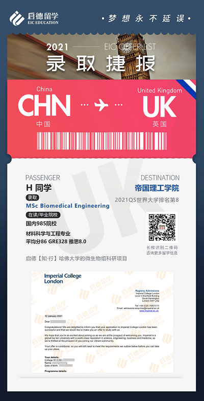我们递交了帝国理工学院、伦敦大学学院、布里斯托大学、格拉斯哥大学的申请。学生递交申请后进入紧张的等待环节,我一发布有学生拿到offer,H同学就会紧张的询问自己的申请进度。最终证明所有的等待都是值得的,在2021年1月,帝国理工学院发来了录取通知书。这离不开早规划的努力,离不开提升软实力背后的辛苦,离不开文书团队的付出,以及学生自己的坚定信念。再次恭贺有梦想的所有学生筑梦路上一切顺利!