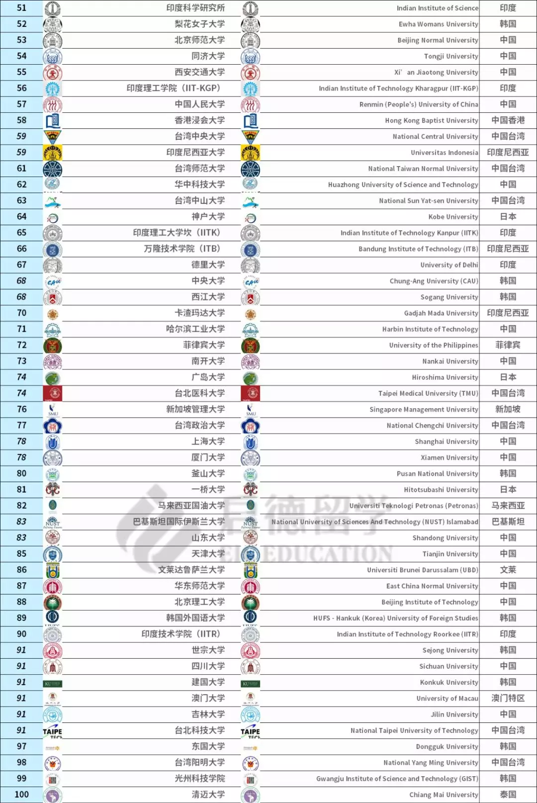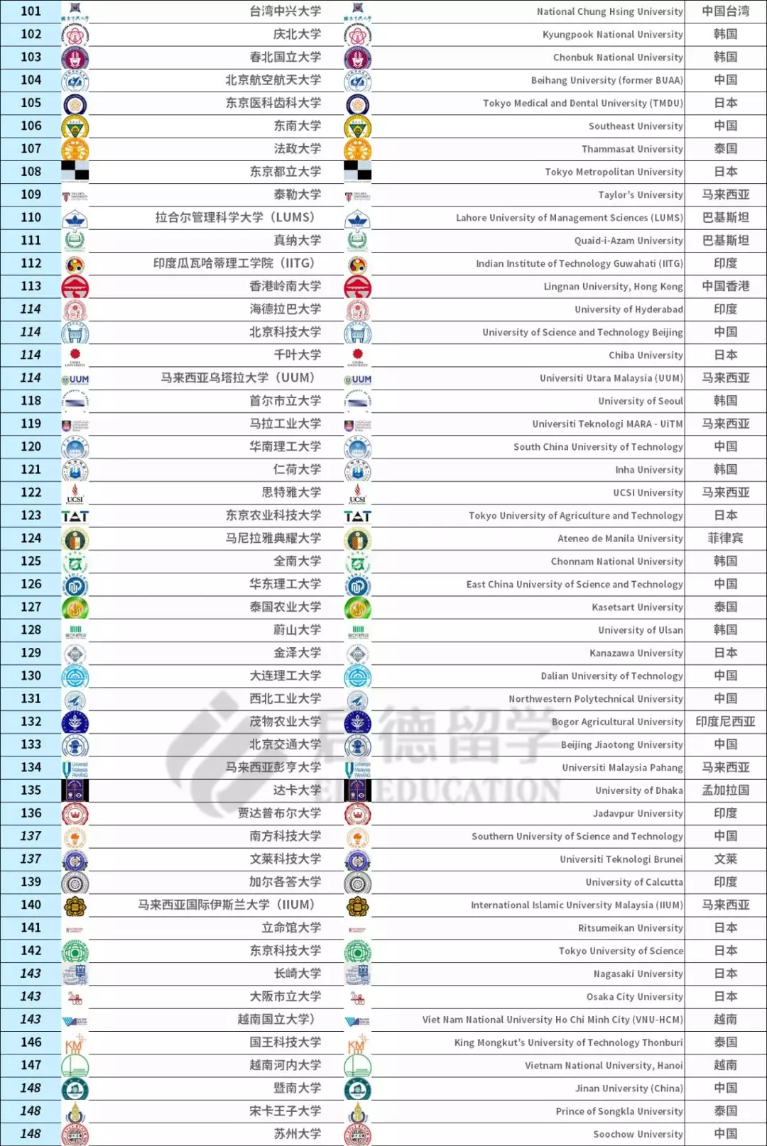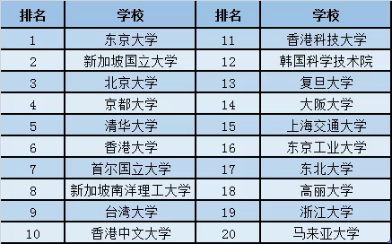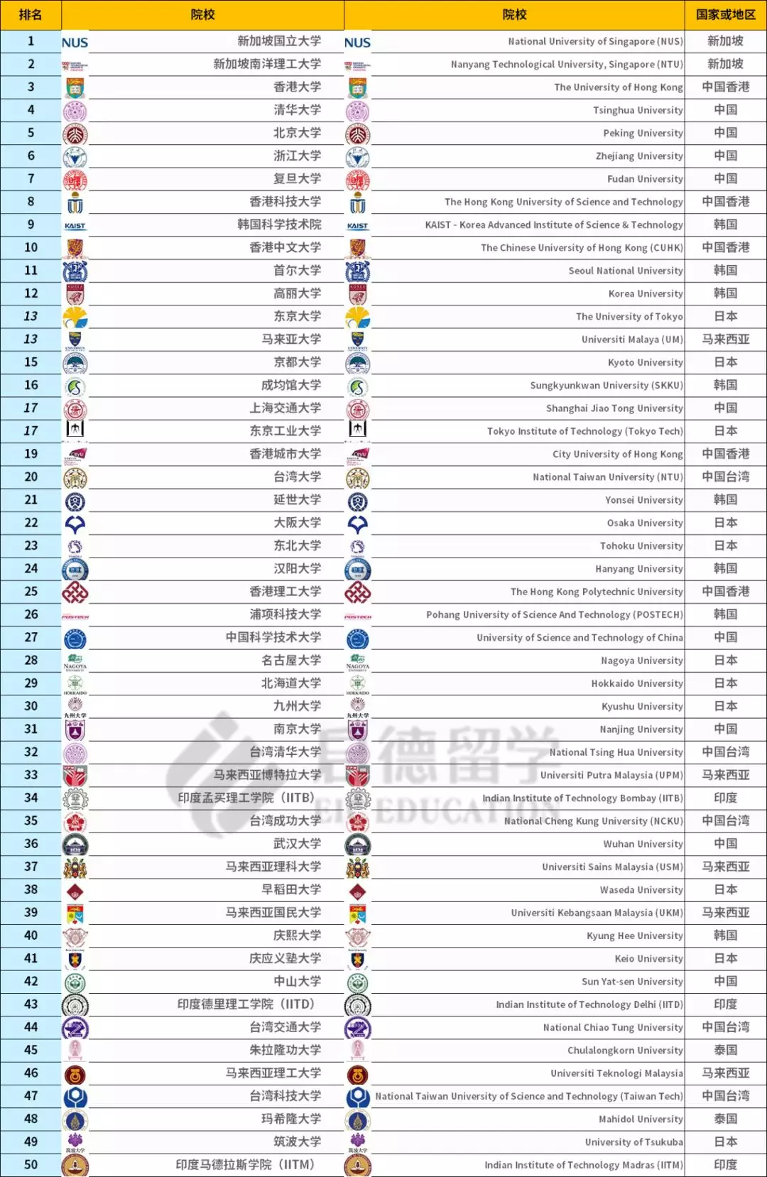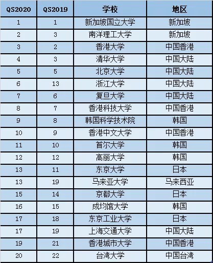 评分标准 学术声誉评价 30% 雇主声誉评价 20% 教师学生比例 10% 国际研究网络 10% 论文引用率10% 教师平均论文量 5% 拥有博士学位的教员比例 5% 国际学生比例 2.5% 国际教师比例 2.5% 出外交换学生比例2.5% 来该校交换学生比例 2.5% 说完了评价标准,下面让我们具体来看看2020年QS亚洲大学排名有何变化: 总体概况 进入本次榜单的院校总共有550所,较去年增加了51所。在收录的500多所院校中,中国凭借163所大学成为了上榜数量最多的国家,较去年增加6所。日本(84所),韩国(71所,较去年增加14所)、马来西亚(29所)、泰国(20所)、新加坡(3所)。 进入总排名前三甲的学校分别是新加坡国立大学、南洋理工大学、香港大学。作为连续三年登顶榜首的新加坡国立大学,在学术声誉、雇主声誉、国际研究网络、国际教师、入学交流和院校交流等细分指标中也交出满分100的好成绩。 我国浙江大学进步非常大,与去年相比进步6名,占领了第6的位置。清华、复旦、港大、港科技大、港中文大学的排名均比去年下降了一位。 值得注意的是马来亚大学在本次排名中进步依然非常大,由去年的19名上升至13名。作为马来西亚最著名的大学,马来亚大学近几年在科研、国际交流以及基础建设方面都在加大投入,这也是为何自2016年以来马来亚大学的排名都在以阶梯形式上升的原因。 (图片数据来自QS世界大学排名) 看完了整体排名,接下来一起来看看占比最重的学术排名情况。 学术排名概况 学术排名主要针对全球8万多名学者的学术调查,可以很好地反映大学在学术上情况。中国进入前20的总共有9所,中国大陆6所,比去年增加了1所,表现较为突出,这与近年来我国不断加大科研投入有关。 日本进入前20的学校有5所,其中东京大学满分上榜,东京大学表现如此突出,这与日本一直以来重视学术、以匠心做学问息息相关。这所世界级著名研究型综合大学采取“教授治校”管理方法,以为各大学院高度的专业性和学术性提供根本保障。正是由于对学术如此重视,东京大学已经培养了11位诺奖得主。 接下来我们就细致地跟大家讲讲排名院校情况。 TOP10排名院校情况 10. 香港中文大学 所在地:中国香港 亚洲今年10所顶尖大学排名第十是是香港(香港中文大学)的中国大学次在排名下降一个点之后进行。香港中文大学的入学交流指标得分最高,在全球排名第四,反映了大学入学学生交流计划的庞大规模。 该大学还以其对研究的高度重视而享誉国际,在国际研究网络指标上的得分接近完美。 9. 韩国科学技术院 地点:韩国 韩国高级科学技术学院(KAIST)位于大田(韩国首都首尔以南150公里),是一所公立大学,学生人数超过10,000。该大学由韩国政府于1971年建立,是韩国第一家以研究为导向的科学与工程学院。 KAIST今年的排名下降了一位,排名第9位。在每个教师和学术声誉指标,试卷分数KAIST以及未来的第八和第12 。 8. 香港科技大学 所在地:中国香港 亚洲第八和世界第32 位——香港科技大学(HKUST)是一个国际性的研究型大学,致力于教育和研究,具有极高的研究成果。 科大每篇论文的引用率和国际教职员工指标在亚洲均名列前茅,分别位居第二和第四,这表明该大学的学术成就强劲,并具有吸引国际教职员工的能力。 7. 复旦大学 地点:中国大陆 复旦大学位于上海市中心,是中国最负盛名的高校之一。该大学成立于1905年,已经培养了许多杰出的校友,其中包括世界银行行长张胜满,以及重新连接断肢过程的先驱陈忠伟。 这所顶尖大学今年在亚洲大学排名中排名第七,在世界排名中排名第 40 ,在各种指标(包括学术声誉和雇主声誉)中得分都很高。 6. 浙江大学(ZJU) 地点:中国大陆 浙江大学(ZJU)是中国历史最悠久的学院之一,最早可以追溯到1897年。如今,浙江大学是中国顶尖的高等教育机构之一,也是亚洲最好的大学之一,今年排名上升7位,名列第六的地方。 ZJU具有强大的国际视野,与全球30多个国家/地区的180多家机构建立了合作伙伴关系,入学学生交换指标在亚洲排名第一,出院学生交换指标在亚洲排名第四 5. 北京大学 地点:中国大陆 现在进入前五名,北京大学连续一年稳居第五。北京大学是中国历史最悠久的一所大学,成立于1898年,自那时以来,北京大学一直被评为中国顶尖的学术机构之一,并以其令人惊叹的校园风貌和中国传统建筑而闻名。 北京大学是亚洲雇主声誉最高的大学,该指标得分完美 4. 清华大学 地点:中国大陆 今年,清华大学排名下降了一位,仅错过了前三名,今年排名第四。该大学于1911年在北京成立,并以其著名的工程学和计算机科学课程享誉全球,使其成为亚洲最好的大学之一。 清华大学还获得了中国大陆排名第一的大学称号,并在2020年名列世界大学第 16 位 -雇主声誉特别好(今年排名第 6 位) 3. 香港大学 所在地:中国香港 尽管在2020年的排名中排名下降一位,但香港大学今年仍位居亚洲前三名高等教育机构之列。香港大学是香港最古老的大学,其历史可以追溯到100年前。 香港大学与全球43个国家的340多所顶尖大学建立了良好的合作关系。该机构今年在世界排名中也表现出色,并列第 25 位,在2020年毕业生就业能力排名中排名第9 位 2. 南洋理工大学(NTU) 地点:新加坡 2020年,亚洲排名第二的大学是新加坡的南洋理工大学(NTU);今年上升一位。南洋理工大学成立于1981年,原名南洋理工学院,1991年才成为南洋理