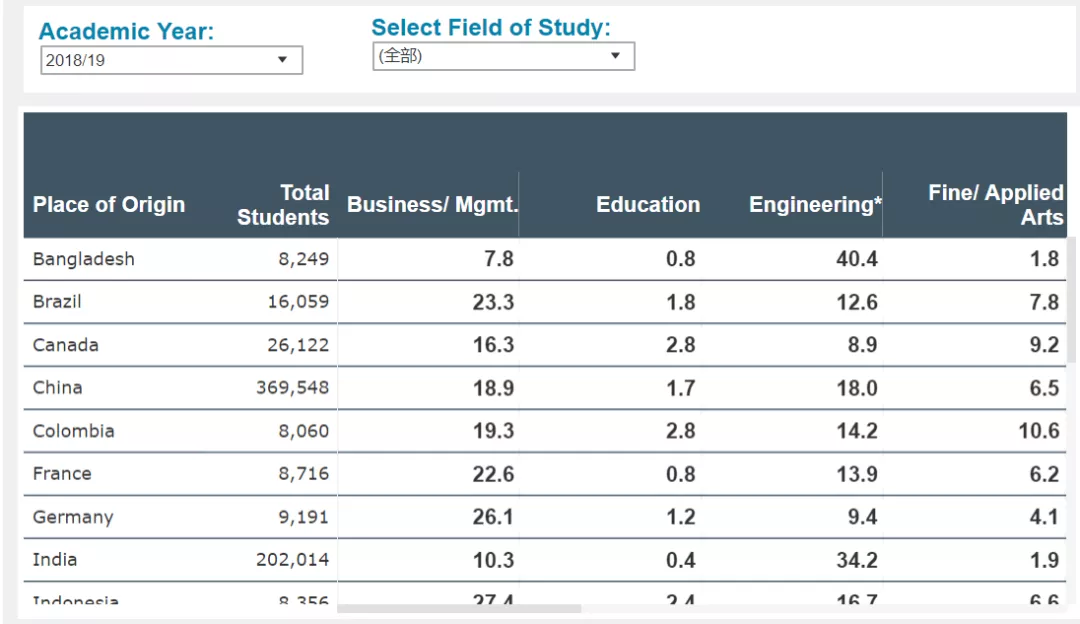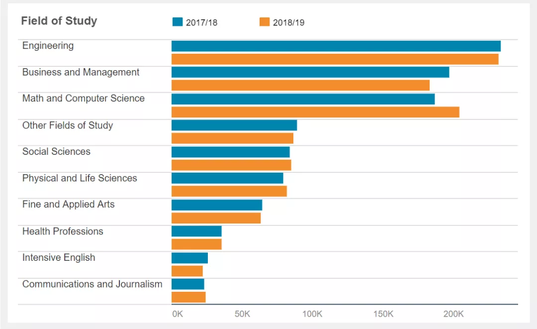要问什么专业最热门,当然是STEM专业。最多国际生选择的的工程专业就读人数略有下降,总人数为230,780人,同比减少0.8%,占国际生总人数的21.1%。数学和计算机科学专业就读人数明显增长,超过商科和管理类专业排名第二,达到了203,461人,同比增长9.4%,这也和目前大热的大数据、人工智能行业发展有很大关系。
