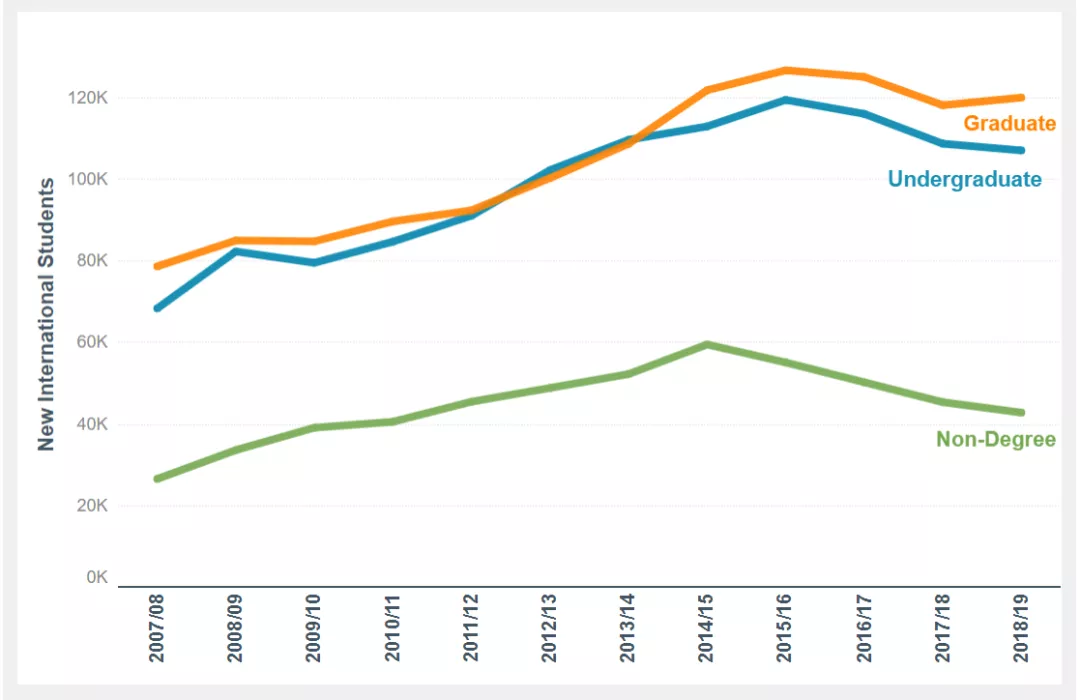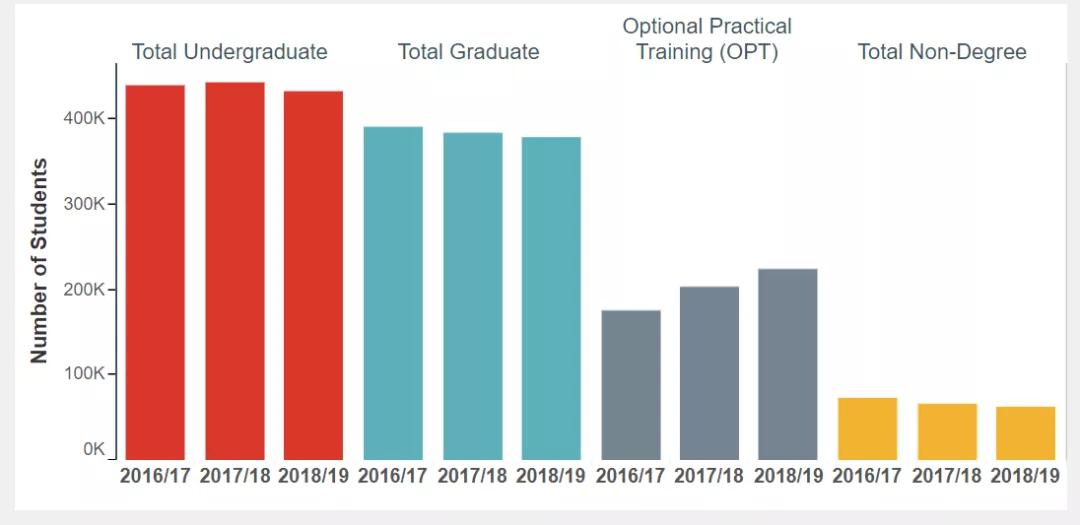 毫无疑问,中国依然是美国最大的国际生生源国(地区)。2018-19学年,共有369,548中国学生就读于美国本科、研究生、非学位及OPT项目,同比增长1.7%。中国留学生数量在留美国际生总人数总占33.7%。