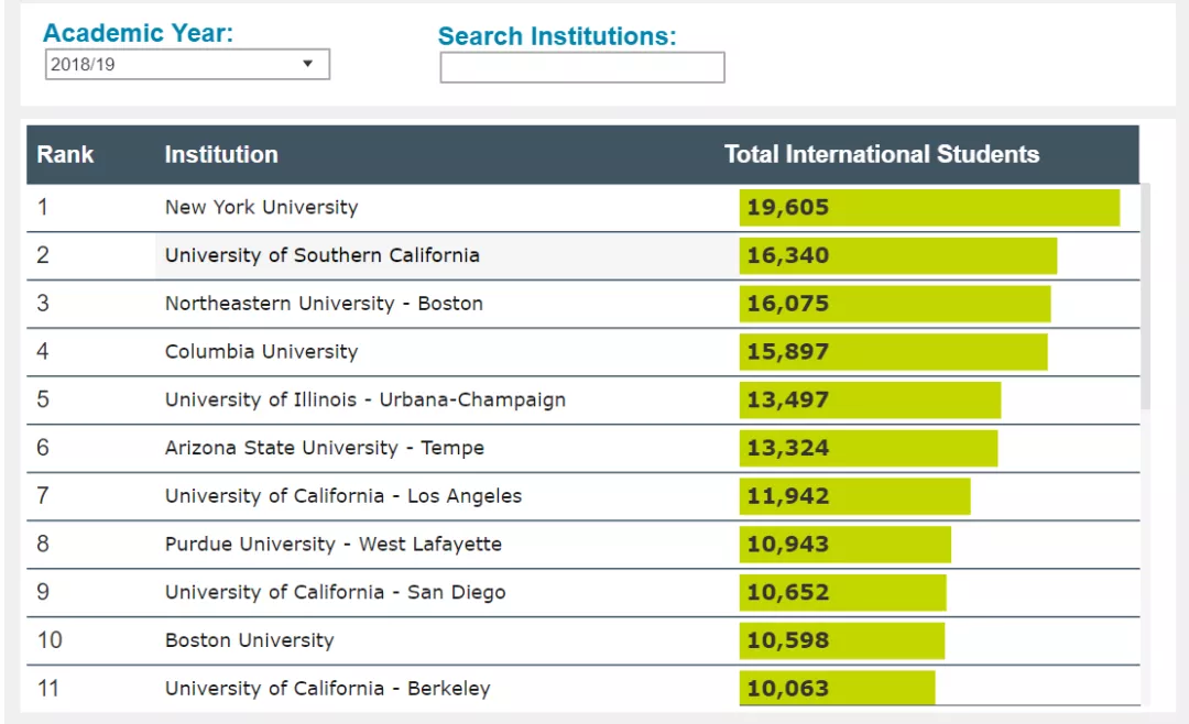 2018-19学年,纽约大学连续第六年成为国际学生人数最多的美国大学,紧接着是南加州大学和东北大学。4-10位的大学还有哥伦比亚大学、伊利诺伊大学香槟分校、亚利桑那州立大学、加州大学洛杉矶分校、普渡大学、加州大学圣地亚哥分校和波士顿大学。