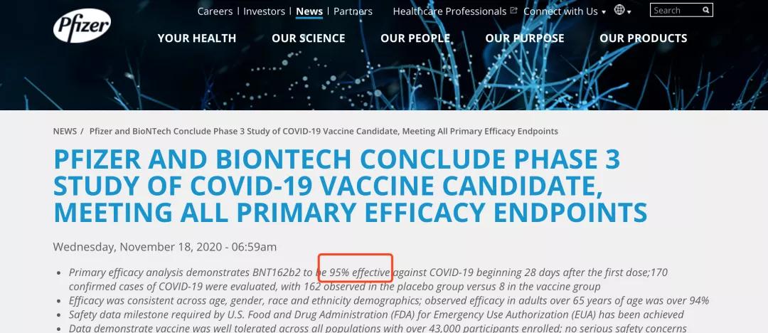 根据辉瑞制药发布的疫苗第三期临床试验结果显示,该疫苗的有效率已经达到了95%,而且没有严重的副作用。数据还显示,该疫苗可预防轻度和重度新冠。对老年人群体的有效率达94%。