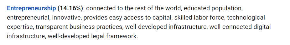 评估一个国家的全球化程度、国民受教育程度、创业及创新能力、资本注入能力、劳动力市场成熟度及技术能力、业务透明度、框架完善程度、数字基础架构以及完善的法律框架等