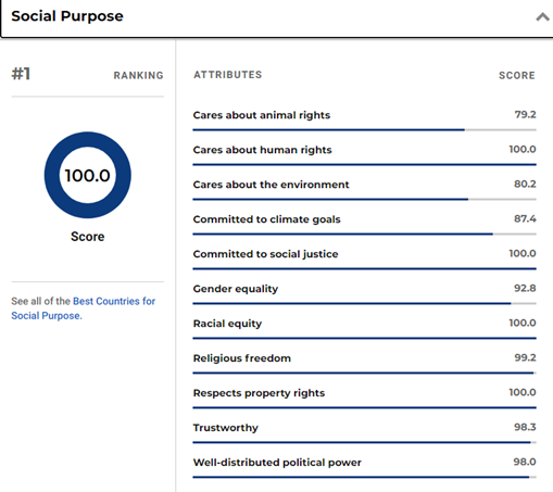 同时在社会目的排名中,加拿大排名第一。