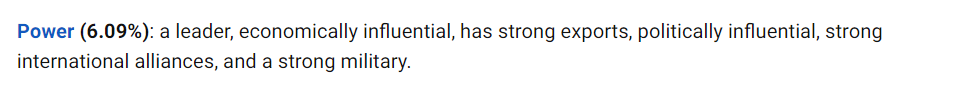 其反映的是一个国家具有经济影响力的领导人,具有强大的出口能力,具有政治影响力,强大的国际同盟和强大的军事力量。