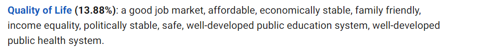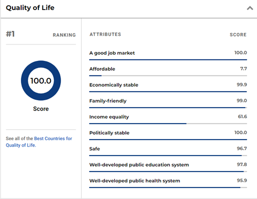 US. New 在今年引入了全新的指标权重和排名方法,反映出与前一年截然不同的结果,全球最佳国家十大评分指标如下: