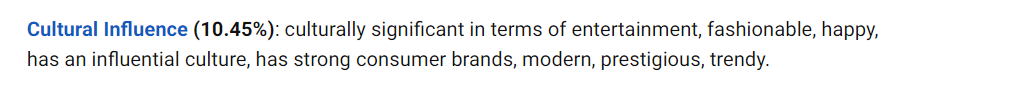 其反映的是一个国家在娱乐,时尚,创新,具有影响力的文化,具有强大的消费品牌,现代,有名望,新潮等方面具有重要的文化意义。