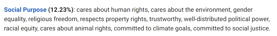 其反映的是一个国家对人权、环境、性别平等、宗教自由、私有财产、诚信指数、政治权利分配程度、种族平等、保护动物、社会正义的重视程度。