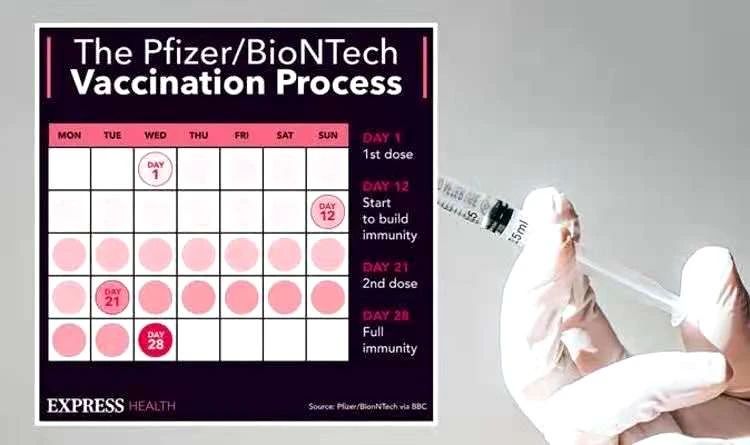 21天后,她将接受另一针加强注射,确保产生足够的抗体对抗病毒。据Sky News报道,疫苗生效的过程如下图所示,在注射第一针后的第12天,身体会开始产生抗体,注射第一针后的第21天,需要注射第二针。