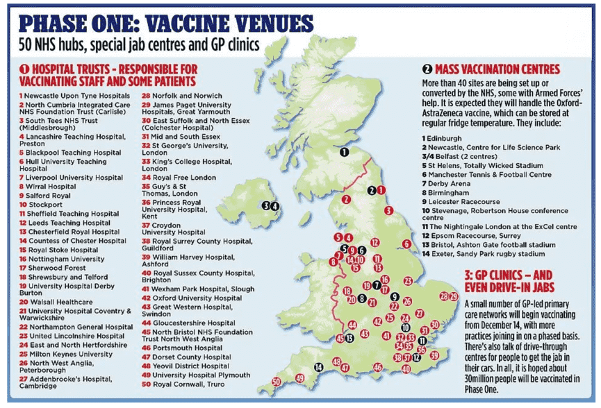 目前,全英已经有50多家医院拿到首批新冠疫苗(如下图所示)。NHS工作人员已经开始紧锣密鼓地联系符合第一批接种要求的人了。