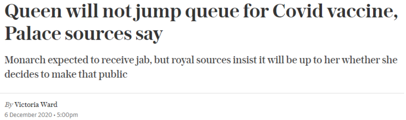 同时,英国王室政要也带头支持疫苗。据悉,英国女王和菲利普亲王符合第一批接种的资格。王室发言人表示,“女王和老公不会插队”。