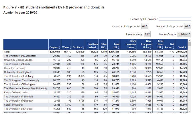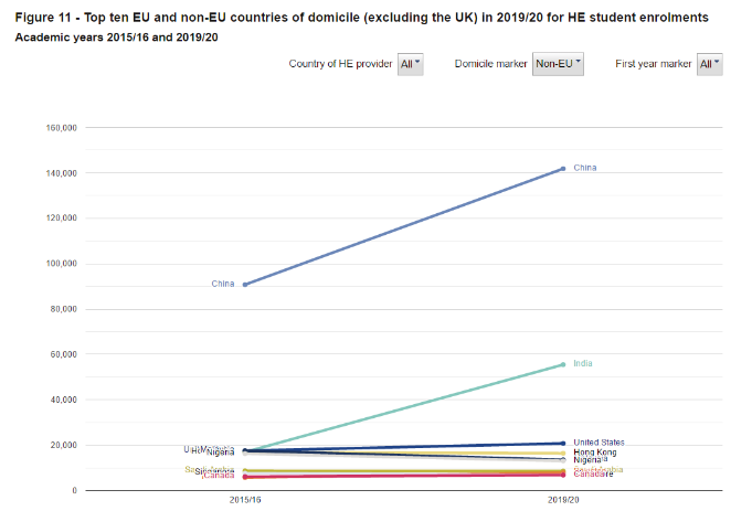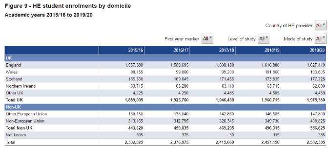 据HESA数据显示,在2019-2020学年,英国各大学留学生总数已超55万,达到556,625人,同比上涨12%。