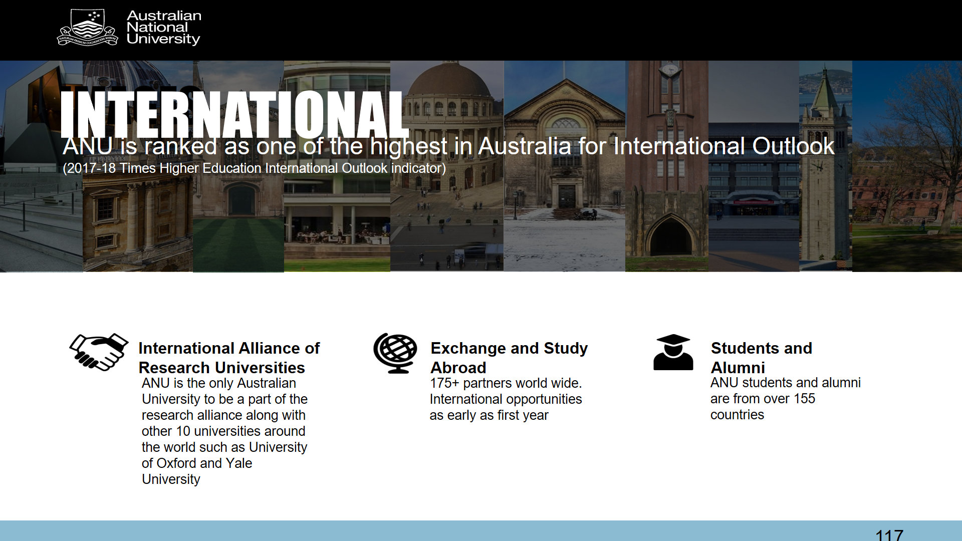 位于堪培拉的澳大利亚国立大学(简称ANU)是澳洲唯一一个国家办的大学,院校排名一直蝉联QS世界大学排行榜澳洲第1。澳大利亚国立大学是国际研究型大学联盟成员。“这个联盟里面除了澳大利亚国立大学,还有大家耳熟能详的牛津、剑桥、美国的耶鲁大学、伯克利、北京大学,还有东京大学、新加坡国立大学,所以同学们如果将来到澳大利亚国立大学留学,会有机会到这些世界上最好的大学去做交换,可以交换一个学期,或者一年。”