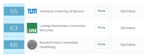 在前100的学校当中,有慕尼黑工业大学,慕尼黑大学和海德堡大学,除了慕尼黑大学和海德堡大学的排名与上次无太大区别之外,慕尼黑理工大学本次排名已经来到54位,较上次有明显提示。