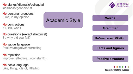 第四,不能有提问, 设问的问题除外。如果需要融入学术界,需要你要对学术英语专业性的句型十分了解。
