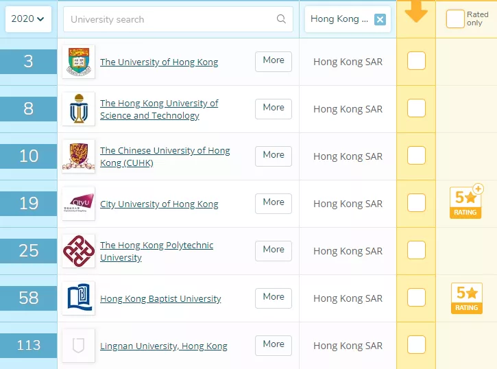 香港主要的八所大学中前三所的香港大学、香港中文大学和香港科技大学均进入了亚洲前十!