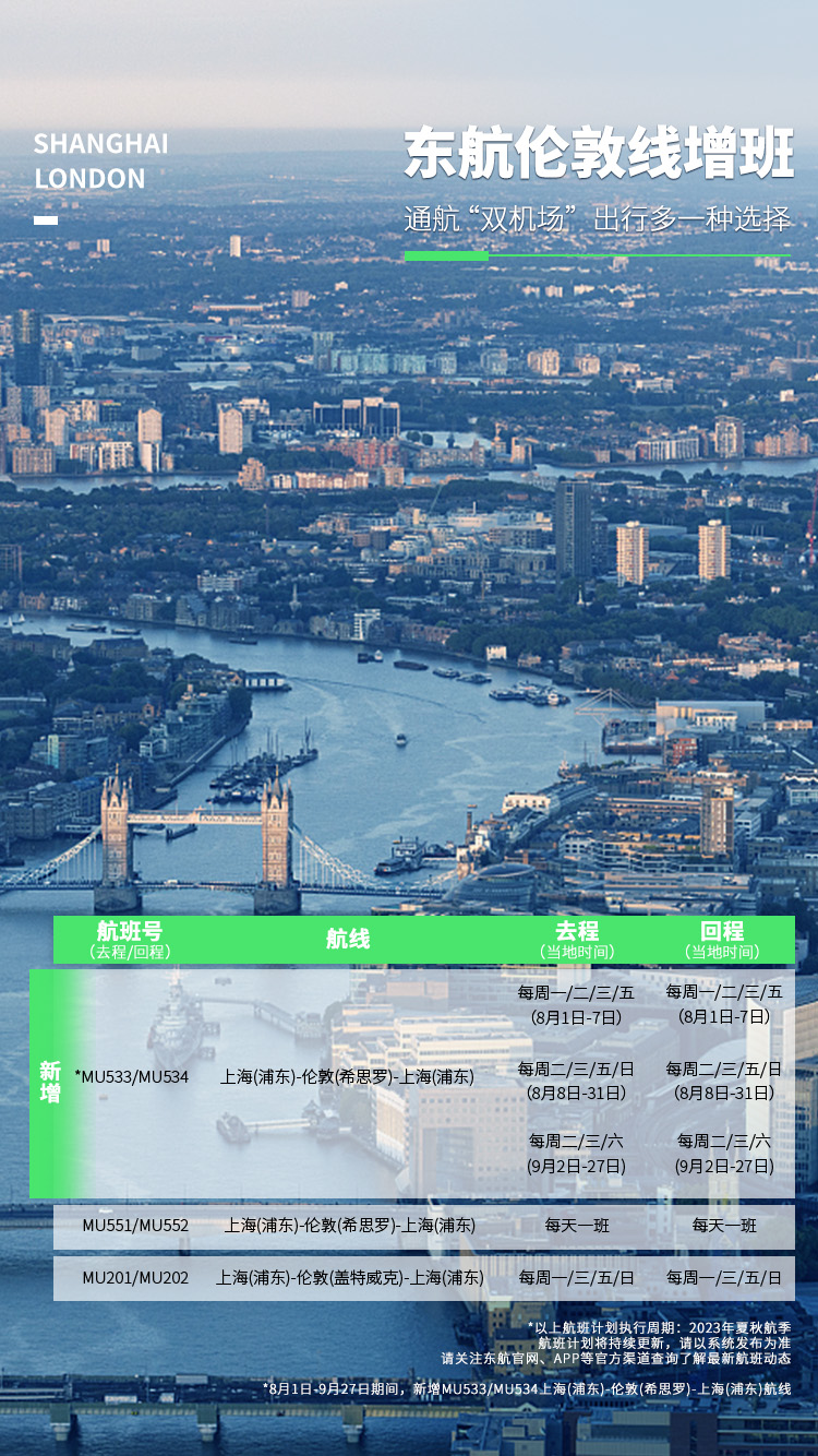 东航伦敦线也增加班次,每周往返新增3~4班,伦敦希思罗/盖特维克双机场落地随心飞!
