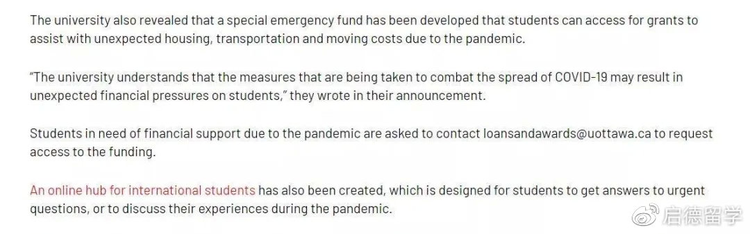 渥太华大学为保障学生的经济状况已经成立了一个特别的紧急基金,学生可以从而获得救济金。