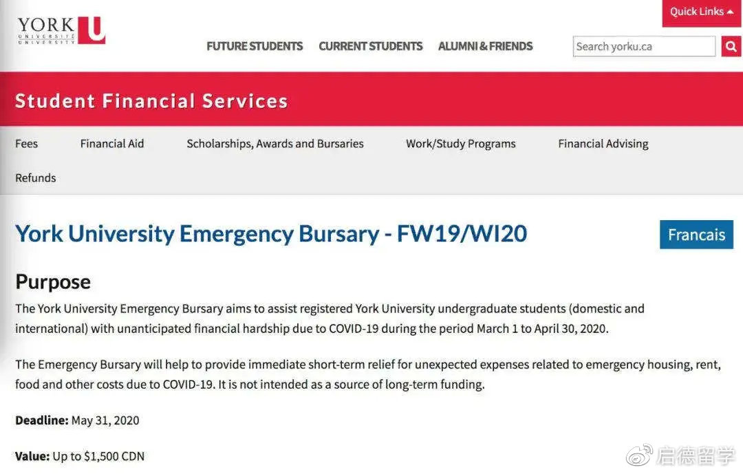 约克大学的紧急补助金与多大的补助金大同小异,也是为了帮助学生们应对由于疫情造成的经济困难,申请日期在3月1日到4月30日之间。补助金最高可达1500加币!