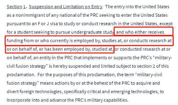 公告声称,中国当局利用一些中国学生(主要是研究生和博士后研究人员)来美国窃取知识产权,因此将暂停/限制来自中国的持有F类和J类签证的、与中国“军民融合战略”(military-civil fusion strategy)有关的中国高等院校的留学生、研究人员、访问学者入境。