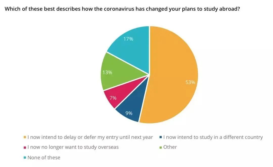 QS询问了具体的影响,例如他们是否希望推迟他们的学业,或者决定在另一个国家学习,不再计划留学等。47%的受访者打算推迟留学,13%的受访者打算出国留学,仅7%的受访者不再想出国留学,人数占总人数比例不到一成中国留学生决定放弃留学的更是仅占