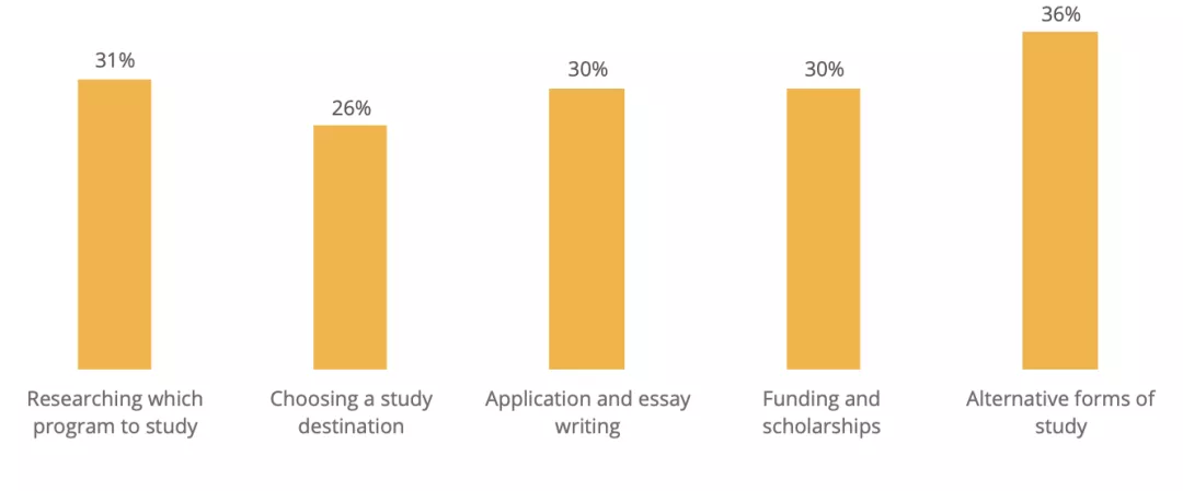 除了线上教学以外,还有许多受访者关注学校对于学生身心健康的保障。超过一半的学生认为24小时求助热线电话和能及时供应的杀菌洗手液是学校应该采取的主要措施。另外,中国留学生们希望各大高校能够提供各种信息和材料以供申请和择校。其中超过三成的人比较关注项目的选择、文书撰写和奖学金。而有36%的人更想要了解高校学习方式的多样性。