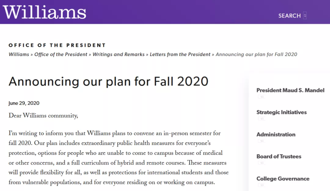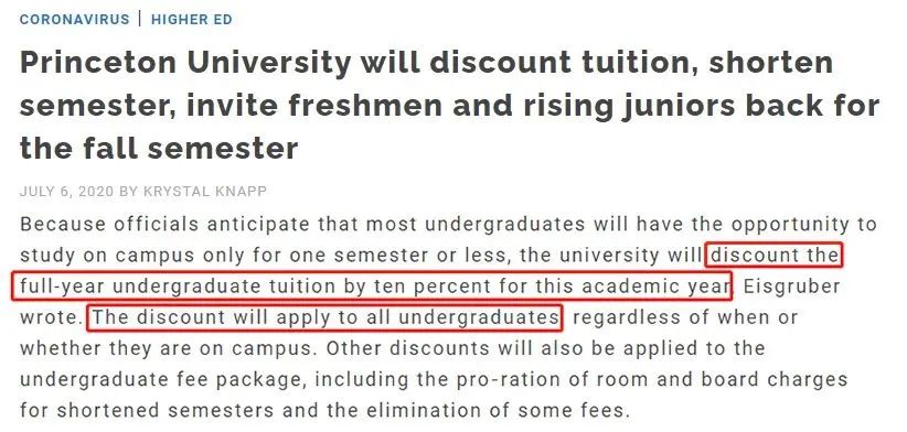 这是美国第一所宣布降低学费食宿费的学校。随后,普林斯顿大学校长也认为远程学习不能提供沉浸式的学习环境,因此决定将学费降低10%,至48,500美元,同时承诺不会收取任何活动或体育费用,将按比例分配食宿费用。