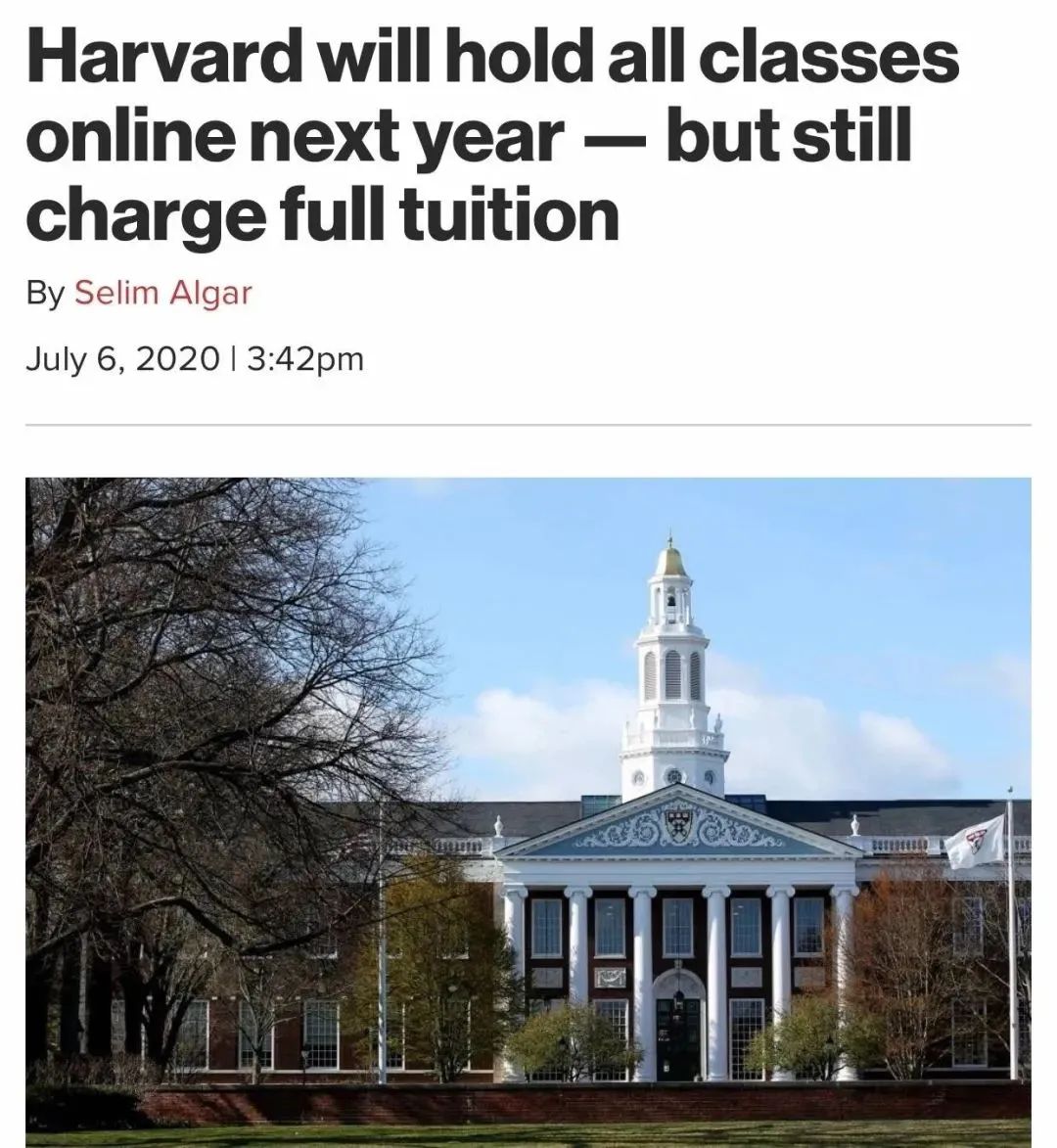 当然也有抵死不从的,比如哈佛大学,7月6日,哈佛宣布明年学生集体上网课,但学费仍旧保持不变,各种花式拒绝退钱。