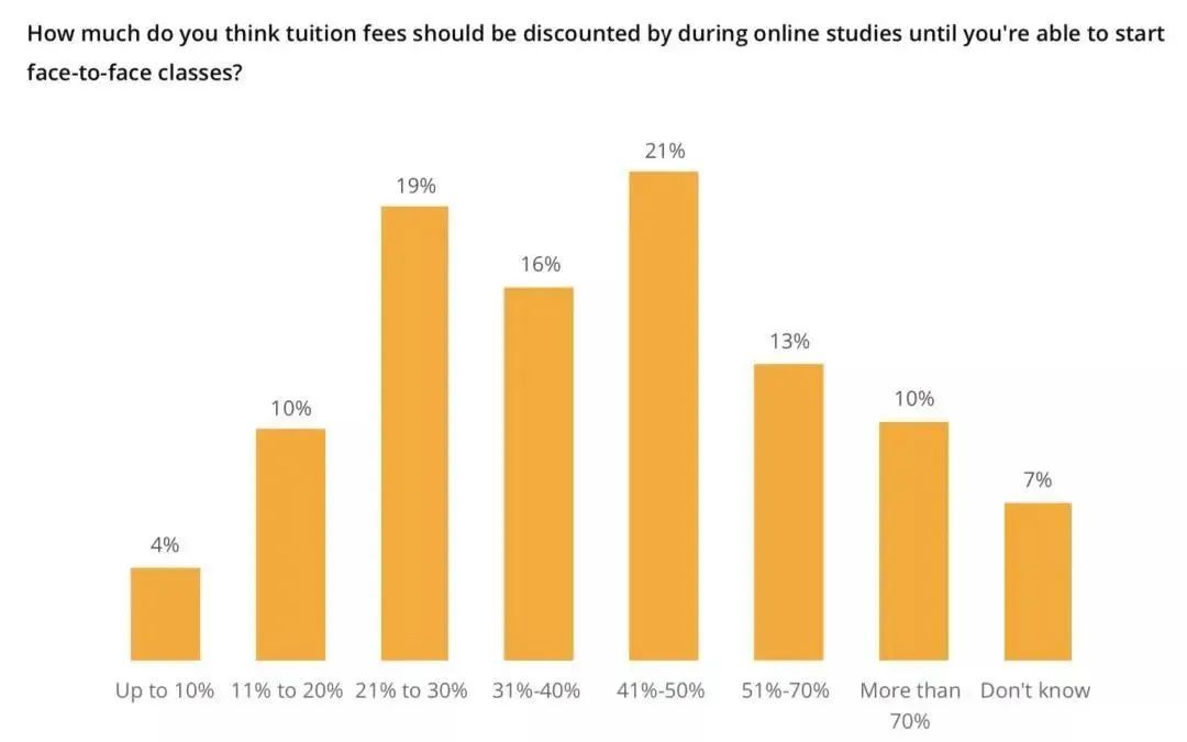 另外本次报告中,有77%的受访者认为既然以网课的方式进行,那么学费就应该得到减免