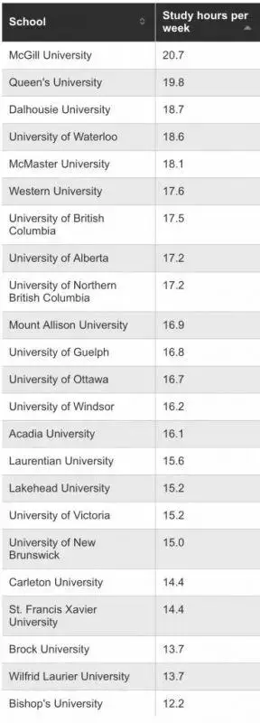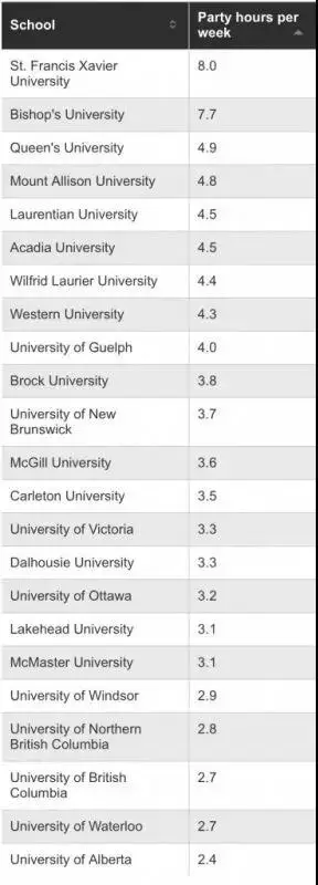 但是各大学校之间的差异较大。Maclean’s计算了一下每个学校学生们平均每周花在学习上和party 上的时间,得出了一份排名。
