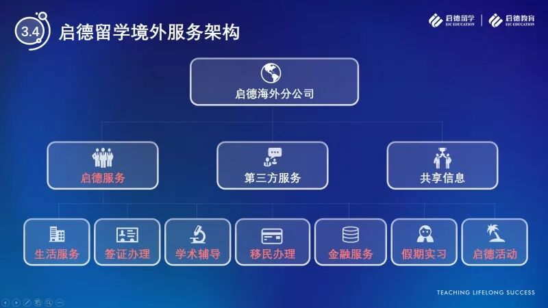 启德教育也充分依托境外分公司的优势,打造了集生活起居、学术辅导、签证办理、移民办理、金融保险与就业实习于一体的启德留学境外服务架构。以启德澳大利亚分公司为例,“入境陪同服务”从私家辅导、入境全程陪同、安居出行指引、入学选课指导方面,“一年学习生活管理服务”从生活寄宿适应、选课方案指引、学习进度反馈、升学志愿指导方面,为赴澳留学生提供学习和生活全方位指导,帮助留学生适应环境,排解压力,调整心态,积极面对陌生的海外生活和学习。