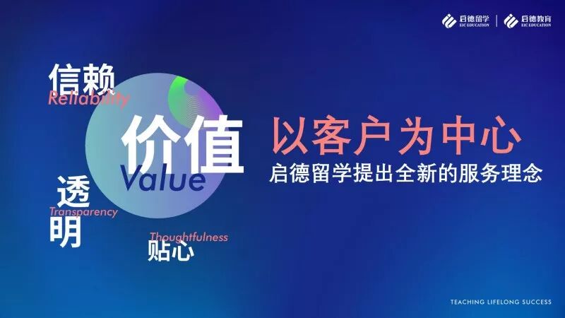 目前,启德教育留学事业部美、加、澳、英、欧、亚六大产品线的上百种产品均对应启德国际人才能力模型七大能力的提升,并覆盖了包括留学申请、背景提升、衔接课程、境外服务、实习就业等不同的客户需求。配合全新的产品体系,启德留学的服务体系也全面升级,本次启德留学提出的服务理念:“价值、信赖、透明、贴心”,四点并非并列关系,而是以“价值”为核心导向,以“信赖、透明、贴心”为支撑。一方面通过多年的行业经验积累,打磨标准化的服务流程及内部审核督导机制;另一方面依托启德国际人才能力测评系统和顾问的专业经验,充分了解客户需求,基于对国外院校办学理念、优势特色、教学方式、教育资源的充分理解,结合学生个人能力和特点进行综合分析,提供更具价值的国际教育规划方案,并将高质高效的服务落实在方案的具体实施过程中。
