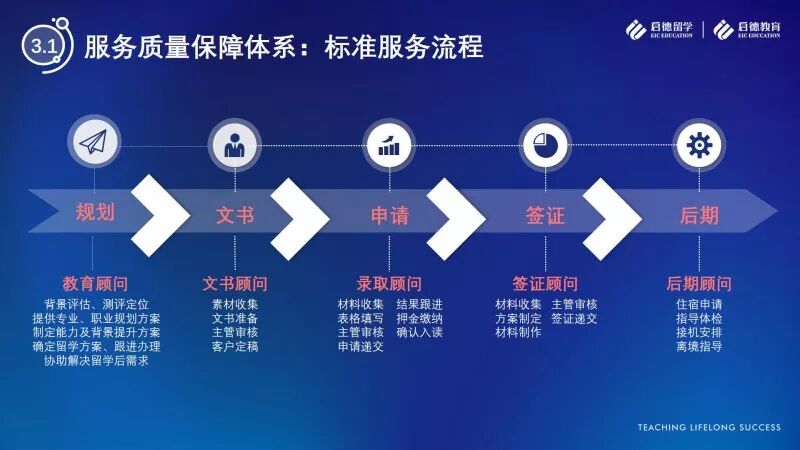 启德提出了“价值、信赖、透明、贴心”服务理念,下一步就是如何让理念落地到服务流程中。通常来看,留学申请是一项琐碎且周期较长的工作,每一个留学申请都包括留学规划、院校申请、签证申请与离境服务四个阶段,每一个阶段由负责不同工作内容的顾问进行对接,启德在留学服务的各个环节都设计了标准流程,从联系客户的时间、与客户的沟通方式,到收集材料的清单等,都有标准的指引及文件包。