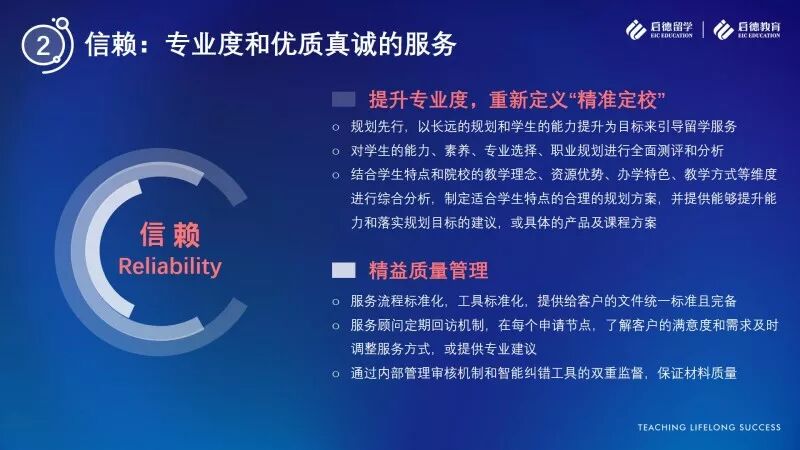 在创造“价值”的前提下,留学服务如何做到值得信赖?启德认为,只有服务过程中体现出的专业度和对质量的把控管理,才能赢得信赖。专业是赢得信赖的基础,升级后的启德留学服务将充分利用人与系统的配合,重新定义“准确定校”。启德留学认为,以规划为纲的“准确定校”不仅体现在掌握准确、全面的院校信息,而是应该强调从系统到个人的分析与整合能力,以充分了解学生的特点为核心,借助科学的工具辅助,结合顾问的经验积累,多维度地分析院校及专业的优势与特点,为学生匹配更适合的规划方案和更合理的落实路径。收获信赖的另一个重点是对工作质量的管控,启德留学会通过质检流程和智能纠错软件的双重监督,来保证留学申请过程的准确和高质量。