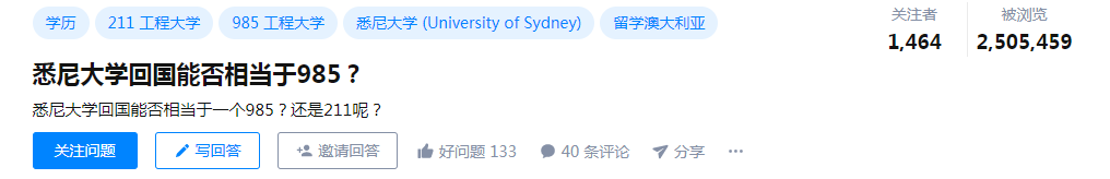 前段时间,有个帖子在知乎上的讨论非常热烈,其中有同学提问:悉尼大学回国能等于985吗?这份帖子被浏览了超过250万之多。