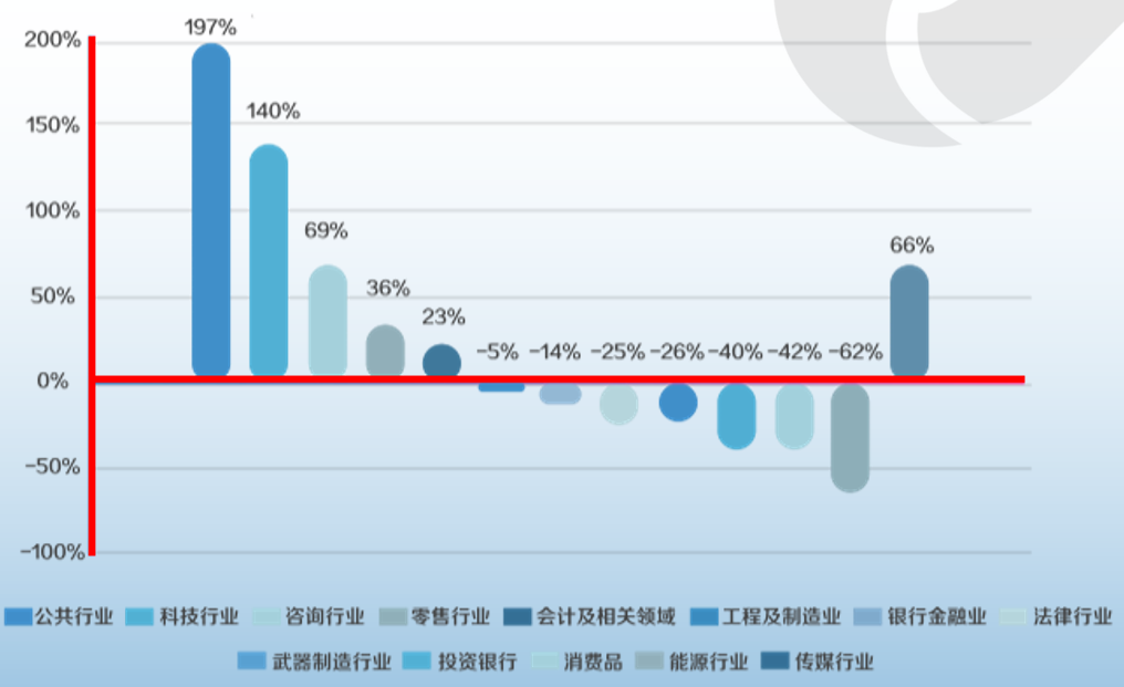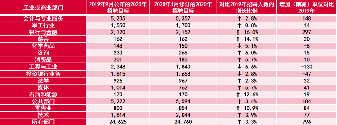 在英国招聘最为热门的十三个行业当中,其中公共行业、科技行业、咨询行业、会计及相关领域以及传媒行业的职位增长最快,到2020年,这些机构总共增加了700多个毕业生职位(包含政府机构、非盈利组织及社会性企业)。相比于2019年的最终招聘数字,预计在2020年的就业市场中15个重点行业和商业部门中有12个行业的毕业生职位空缺将增加。