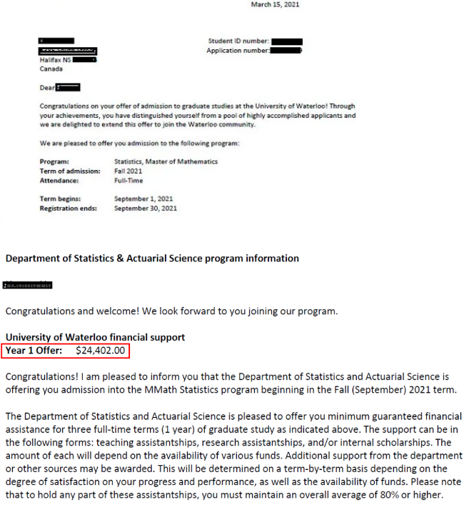 录取学校及专业:University of Waterloo: Master of Mathematics in Statistics,同时收到价值24,402.00加币(约12万人民币)助学奖学金