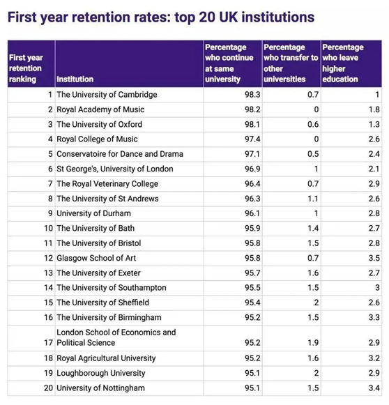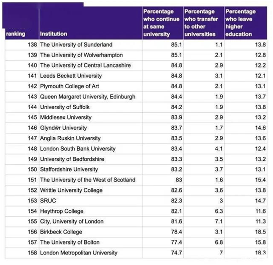 为了让大家更直观的感受到自己学校考试的通过率,前段时间,英国高等教育统计局 HESA(Higher Education Statistics Agency)还专门调查了英国191家提供大学高等教育的学校/机构,并根据158所大学/机构提供的有效数据,统计了英国各个大学的第一学年通过率,转学率和辍学率,可以作为大家择校时的参考标准之一。