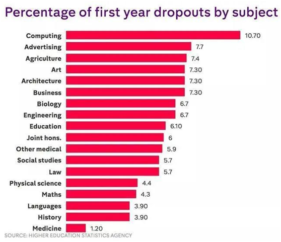 紧随计算机其后的辍学率最高的专业分别是广告、农业、艺术、建筑师以及商科。而最容易通过的是历史、语言和药学。