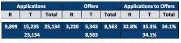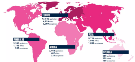 在学生来源方面,31.48%的海外申请者来自于亚洲,在9714位亚洲籍申请者中,1935人拿到了offer,offer率为19.92%。