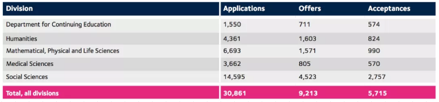 在录取数据方面。2019-2020年申请季,牛津大学总共收到了30861份研究生申请,发出了9213份offer,总体研究生offer率约为29.85%。除了继续教育学院以外,剑桥大学研究生项目总共可以分为四大分类学科,包括Social Sciences; Medical Sciences; Mathematical, Physical and Life Sciences; Humanities