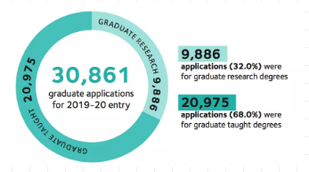 首先,我们来看一下牛津的数据。在过去的十年间,牛津大学研究生项目的申请量足足增长了75%,从10年的17500人上涨到2020年的3万人。在收到的超过3万份的研究生申请中,68%的申请者申请的是教学型硕士项目。