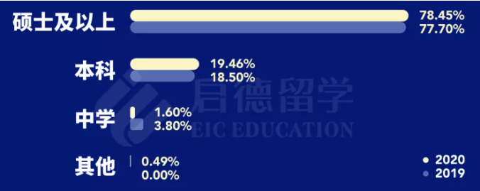 根据启德《2020年新常态下的留学报告》,近两年来学生们出国留学所攻读的学位,依然以硕士及博士为主体。