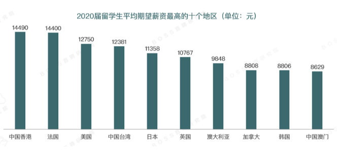 BOSS直聘研究院数据显示:回国求职的留学生学历普遍在本科以上,超过半数期望在一线城市发展,其平均期望薪资高达10725元,是大陆2020年应届生平均期望薪资的1.7倍。其中,中国香港、法国、美国三地的留学生平均期望薪资位居前三甲。中国香港高校毕业生期望在一线城市发展的比例高达73.6%,硕士及以上学历占比93.7%,均位居十个地区中首位。
