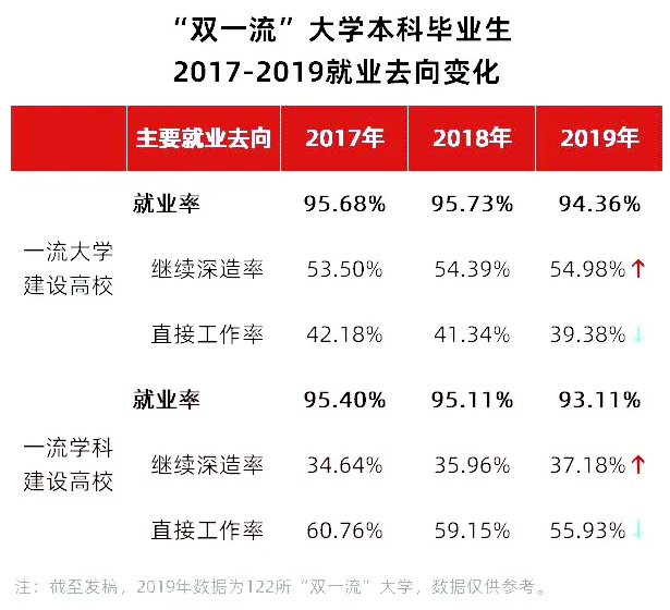 根据软科2020年3月发布的《122所“双一流”院校就业及深造率大数据分析》,三年来,双一流院校的继续深造率在持续上升。尤其是一流大学建设高校,继续深造率甚至达到了54.98%。