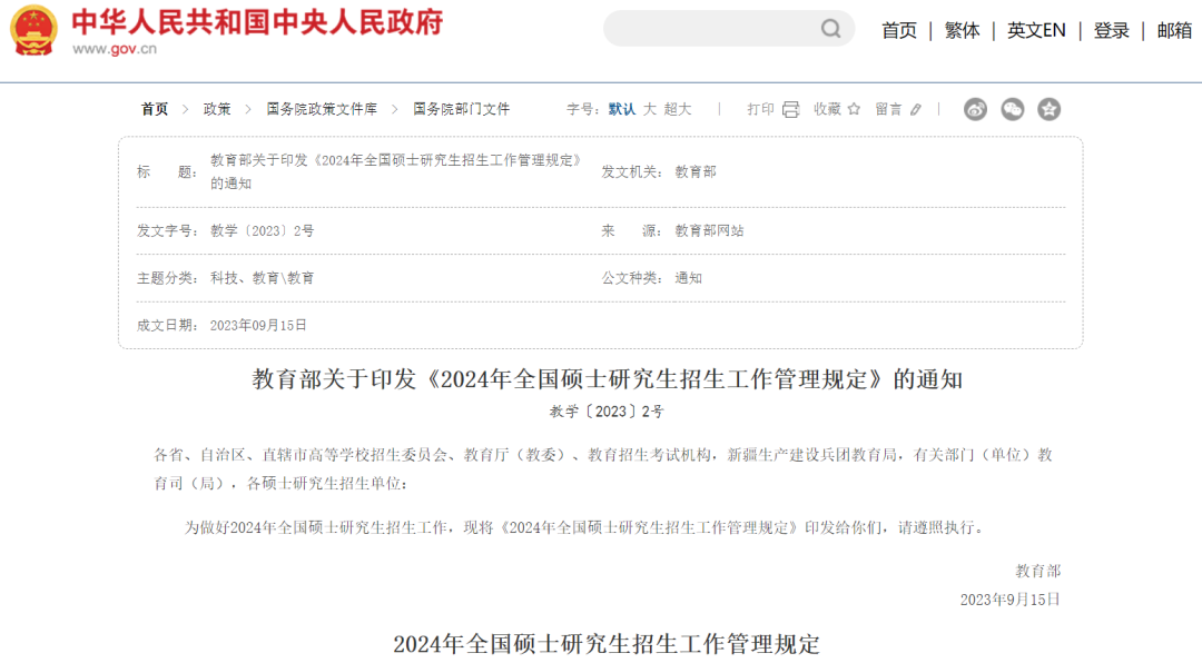 教育部近日印发《2024年全国硕士研究生招生工作管理规定》,2024年全国硕士研究生招生考试初试定于2023年12月23日至25日。