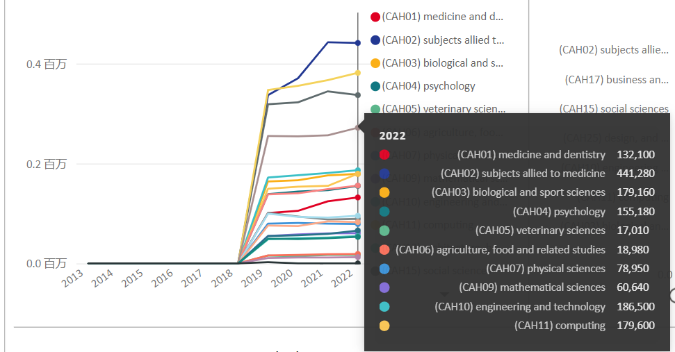 其次,社科专业(Social Sciences)2022申请量也有不小的增幅,一共有336,930人申请,仅次于医学和商科。