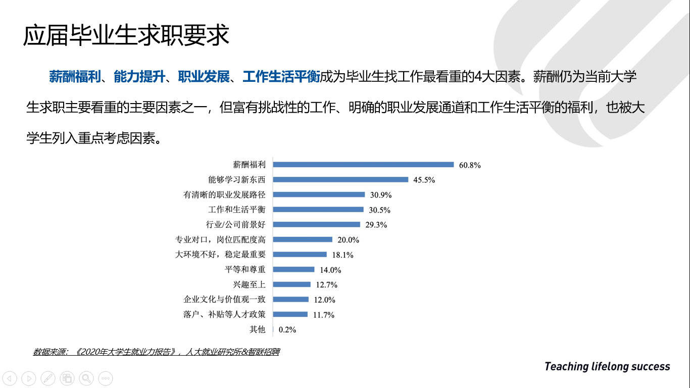 与此同时,薪酬福利、能力提升、职业发展、工作生活平衡成为毕业生找工作最看重的4大因素。什么是职业发展? “很多人喜欢跳槽去私募股权基金或者PVC,风险投资的行业当中,工作的时长是原来的1/2,薪资比以前更多,也叫体制内退休。PVC老板要求的事情,比如说这个月把1000万花掉,投给有价值的公司,投不出去的话就开除你。应届毕业生肯定是做不了这份工作吧?谁来去做?显然是有工作经验的,比如说从投行券商跳出来的,这些公司会喜欢。”以金融圈较受欢迎的投资行业为例,Veen对如何从从一个行业向另外一个行业跨越进行了经验分享。
