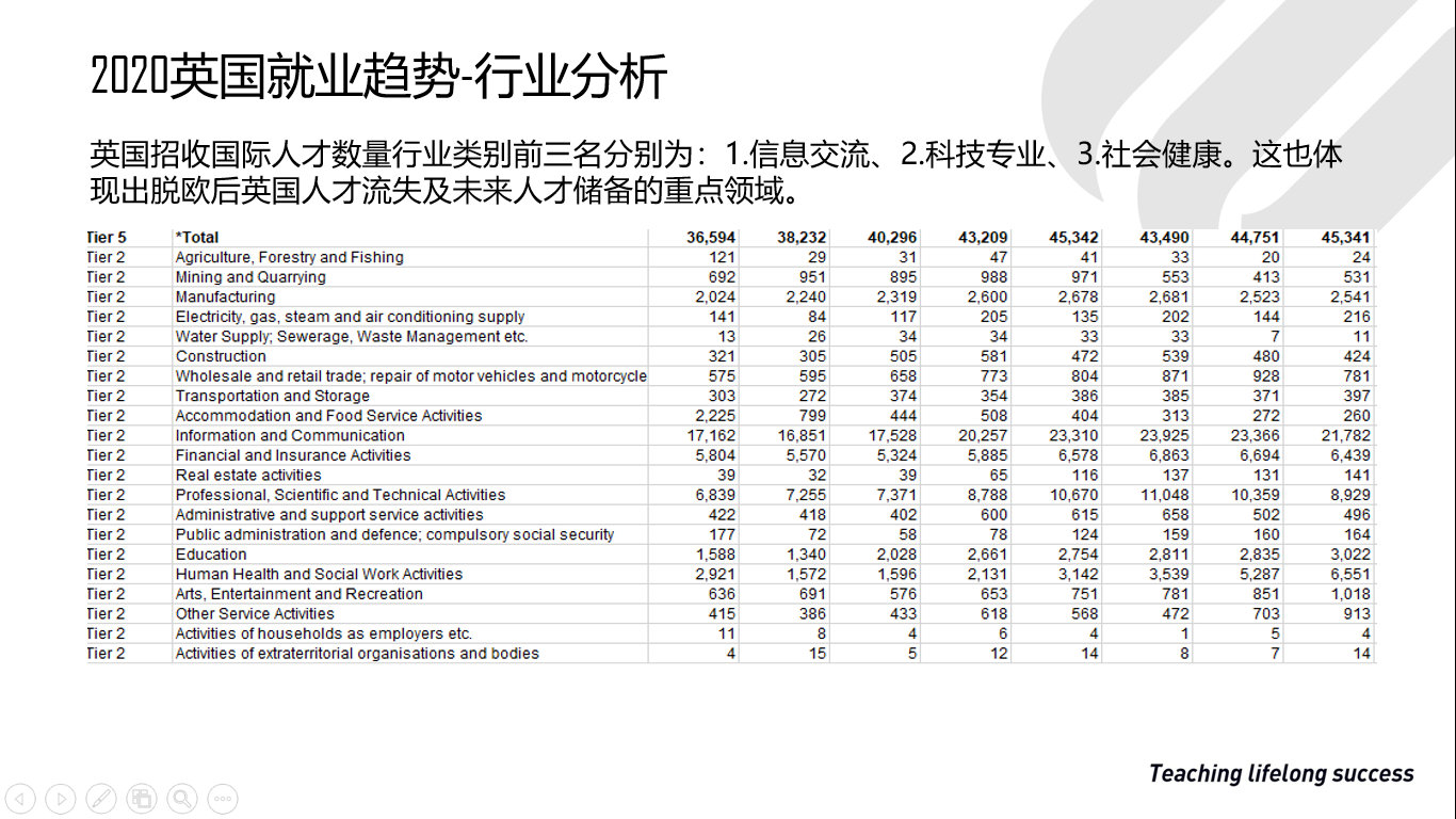 “英国的劳工部官网数据显示,英国招收国际人才数量行业类别前三名分别为:信息交流、科技专业与社会健康。这也体现出脱欧后英国人才流失及未来人才储备的重点领域。”Veen强调英国的就业趋势与中国有相似之处,数字传媒、计算机互联网、电子电气工程都是机会较好的热门行业。